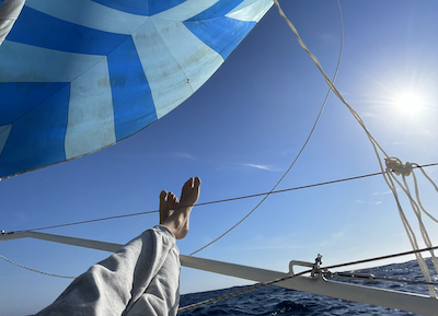Coucou! We really appreciated our no-stress week aboard Acid Rain! Though Alex might seem to live like an old sea wolf, he perfectly adapted to us and our wishes. Anchored in a very calm bay of Sal Island in Cape Verde, we switched between relaxing moments, English classes, and fun activities such as surfing and spearfishing (thanks for the yummy garlic bread and fishcakes captain). We also had the chance to feel Acid Rain sliding on the water twice, safety guaranteed with First Mate Patches at/on the chart table 😁 See you soon dude, Farsadennec will catch you up soon! Bon vent, belle mer!. Yuna and Florian